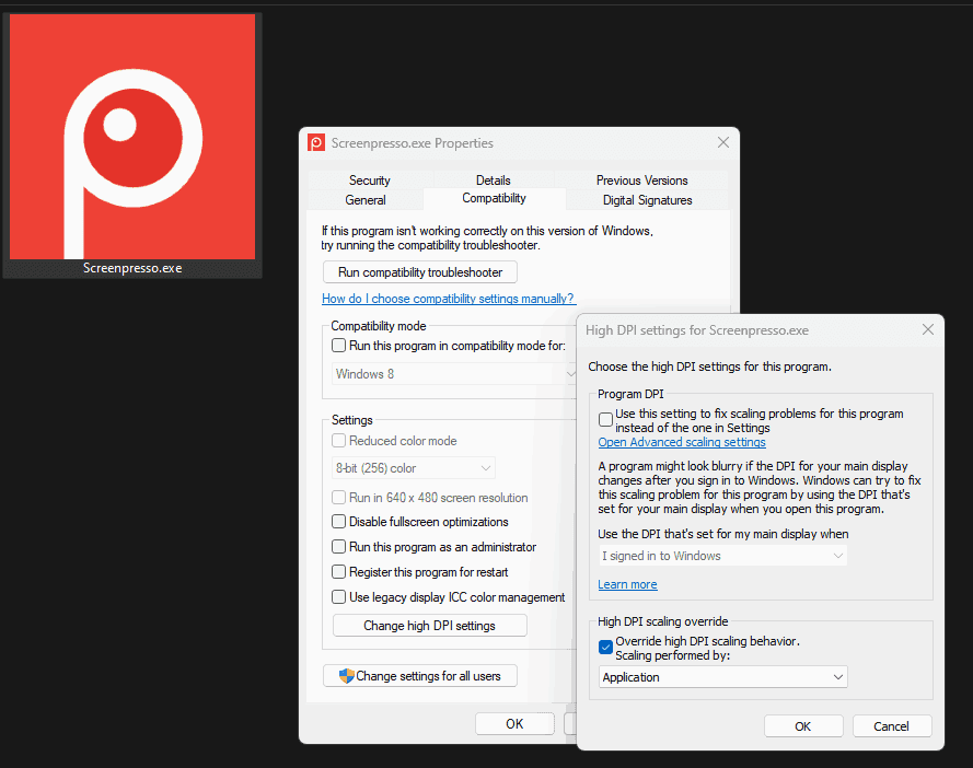 In this case you can force Windows to run Screenpresso.exe with High DPI scaling override set to "Application". Screenshot of properties